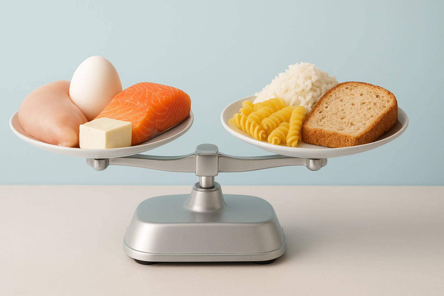 Waga z posiłkami zawierającymi białko po jednej, i węglowodany po drugiej