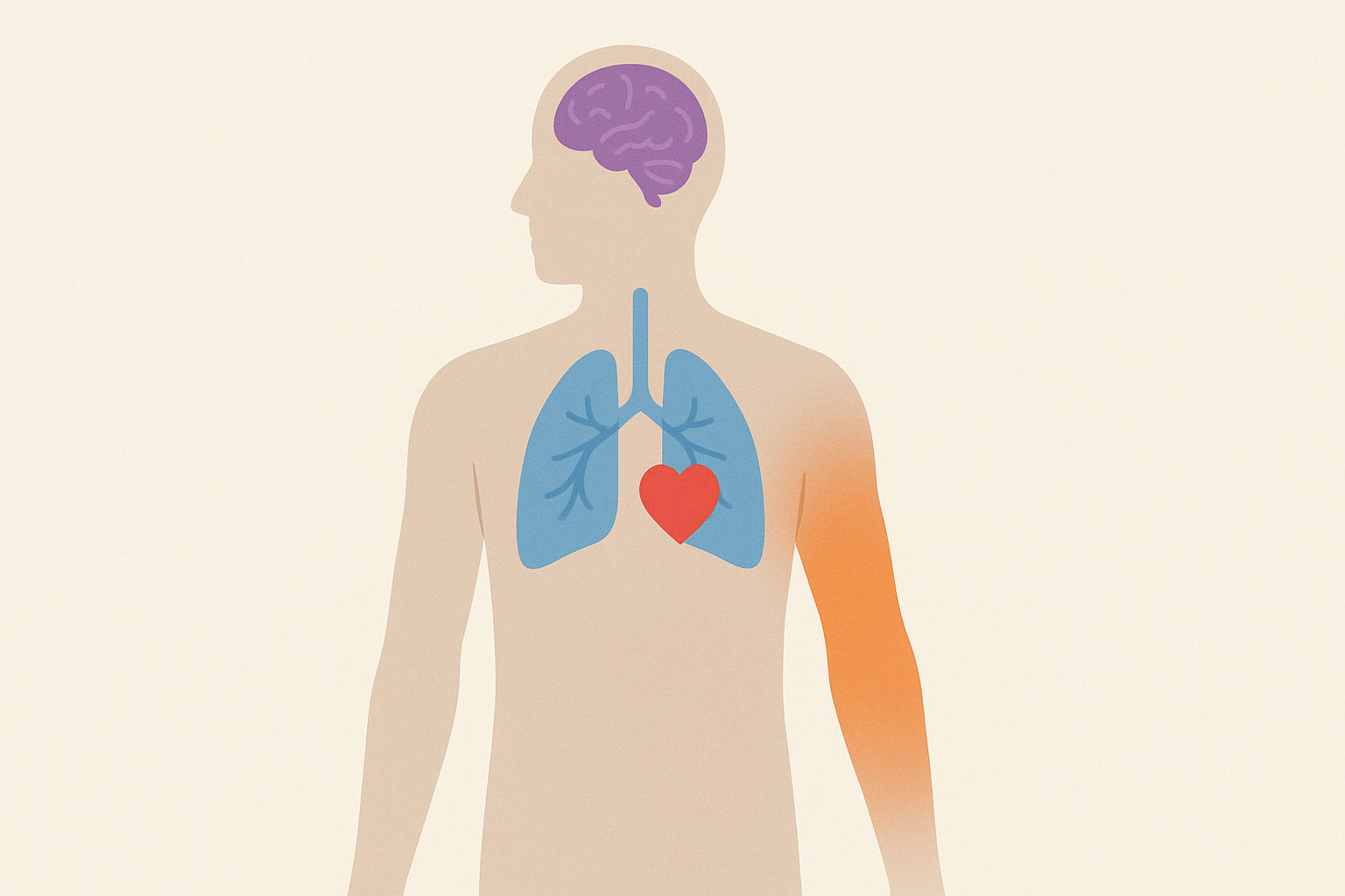 Ilustracja ze wskazaniem serca, płuc, mózgu i ręki - najczęstszych powikłań po COVID-19