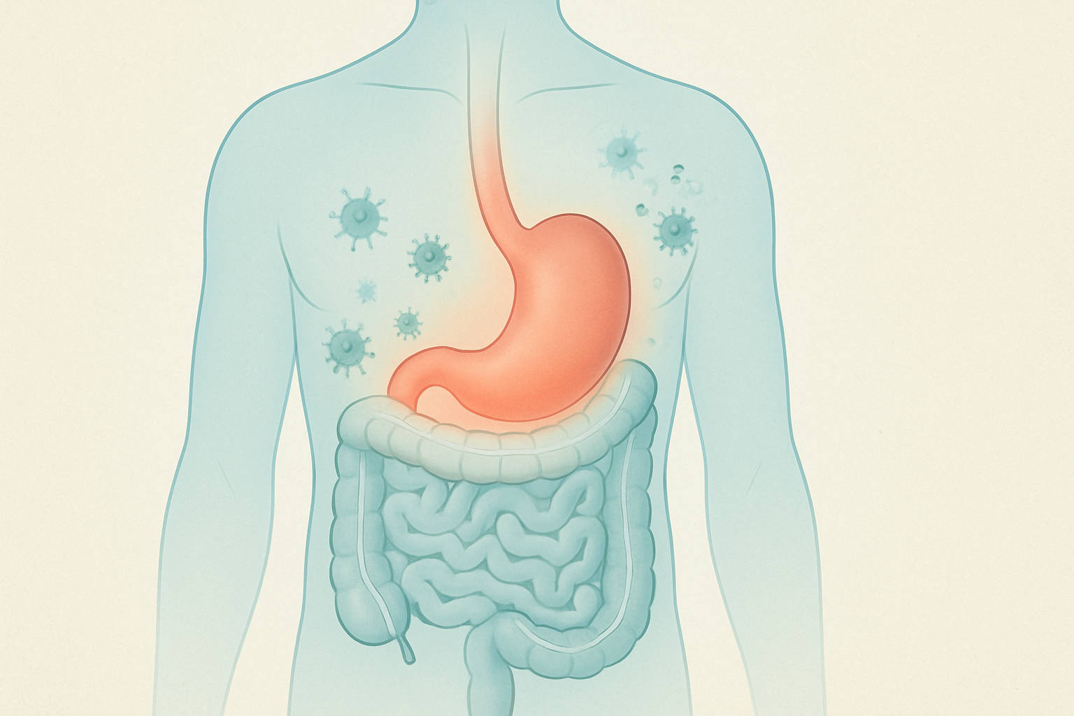 Rysunek anatomiczny ludzkiego ciała z zaznaczonym żołądkiem, kontekst grypy żołądkowej