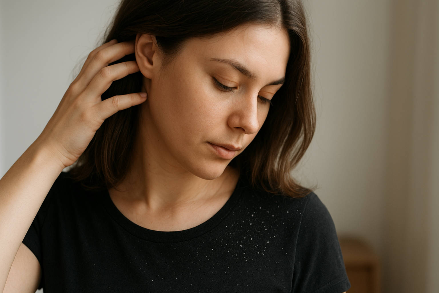 - Widoczne białe lub żółtawe łuski na włosach i ramionach