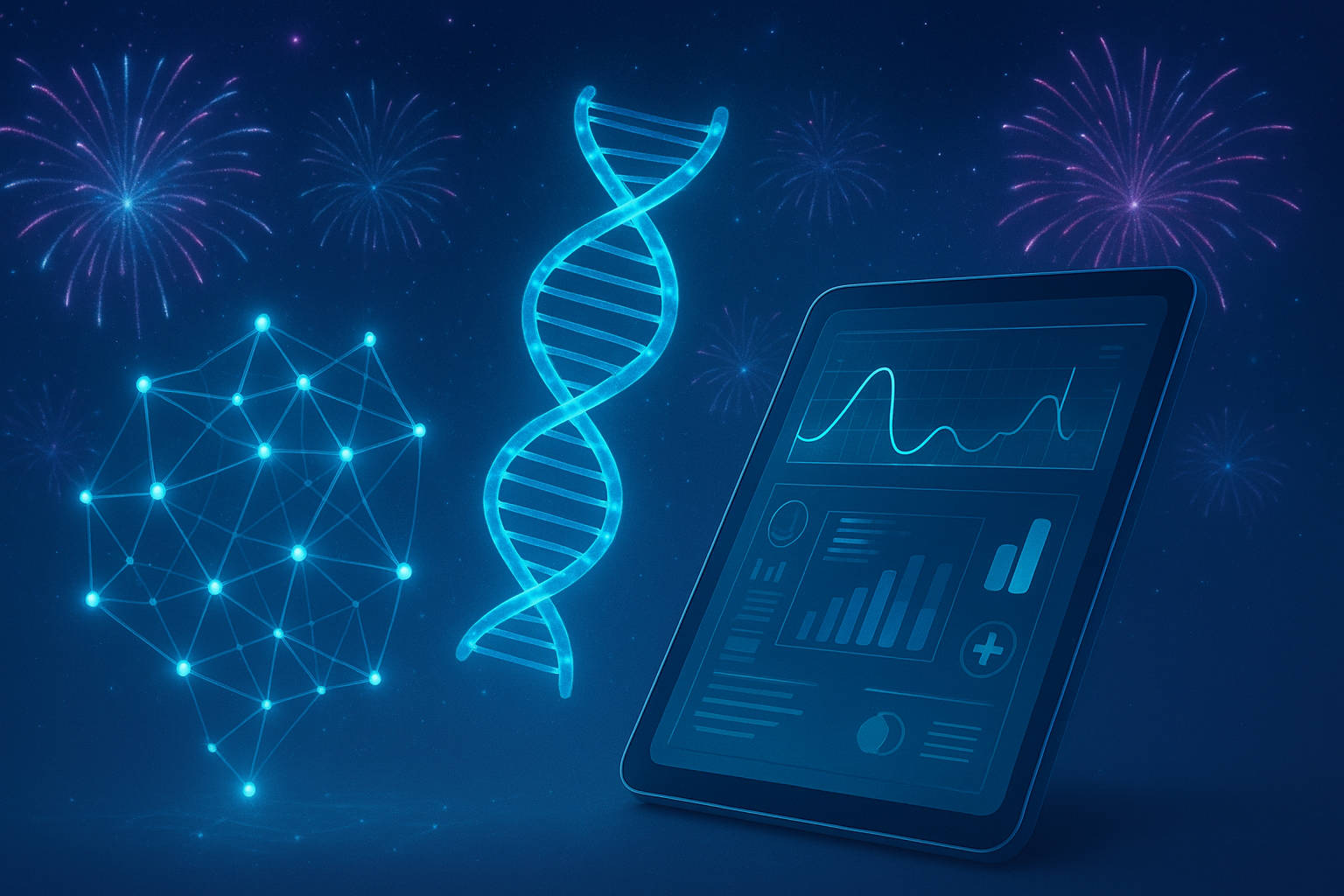 DNA, dane na tle fajerwerków, metafora trendów w zdrowiu i farmacji na nowy rok