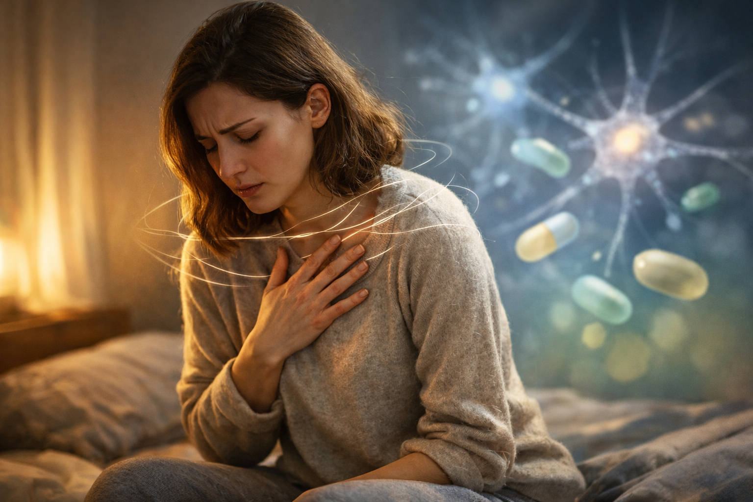 Kobieta z napadem lęku siedząca na łóżku, w tle ilustracja suplementów, związana z niedoborami