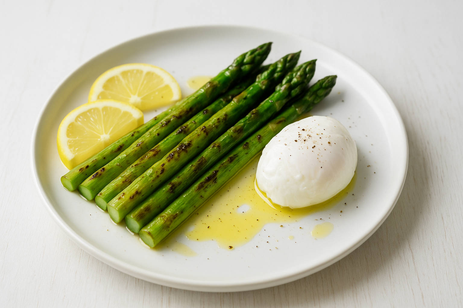 Talerz z grillowanymi szparagami na maśle, z jajkiem i plasterkami cytryny