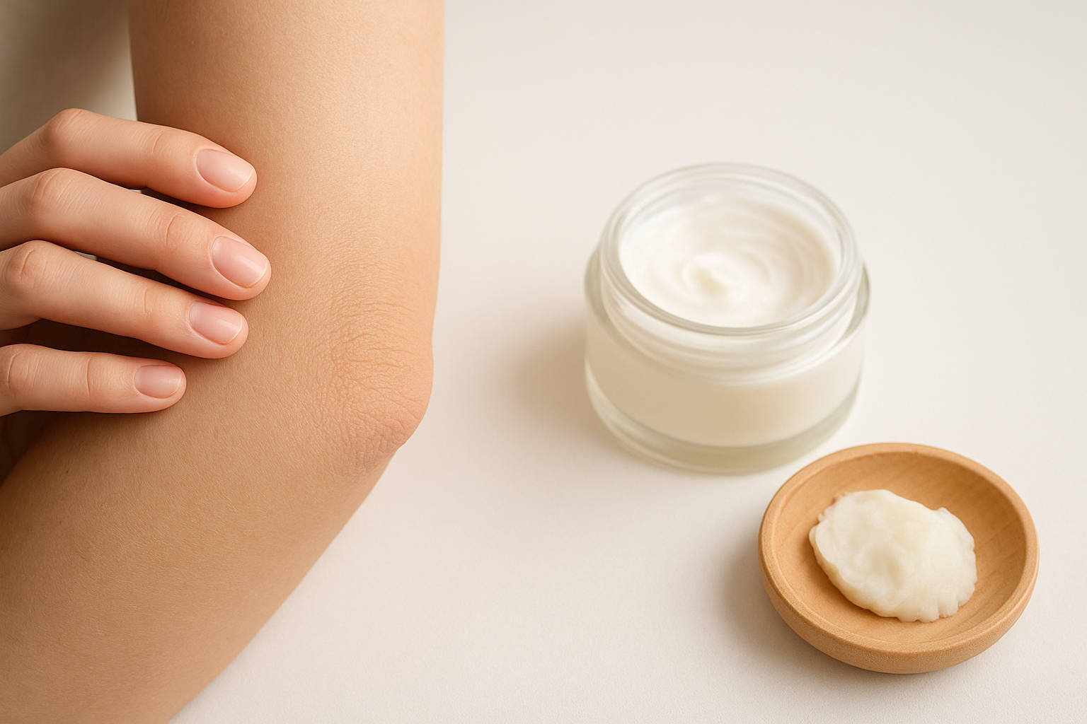 Kobieta z wysuszonym łokciem stosująca krem łagodzący