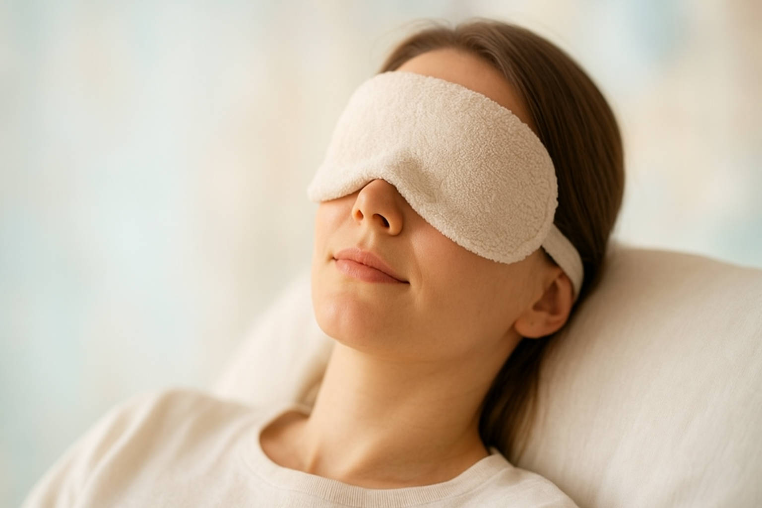 Kobieta odpoczywająca z opaską na oczy, cierpiąca na zapalenie spojówek
