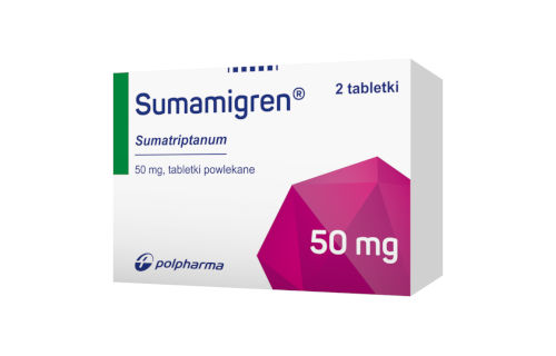 Działania niepożądane zostały pogrupowane według częstości występowania, określonej w następujący sposób: bardzo często (≥l/10); często (≥l/100 do Zgłaszanie podejrzewanych działań niepożądanych Objawy Leczenie Grupa farmakoterapeutyczna: Leki przeciwmigrenowe; selektywni agoniści receptora 5-HT1 Sumatryptan jest swoistym i wybiórczym agonistą receptorów serotoninowych 5-HT1D. Nie wpływa na inne podypy receptorów serotoninowych (5-HT2 do 5-HT7). Receptory te występują głównie w naczyniach krwionośnych obszaru ukrwienia tętnicy szyjnej. Sumatryptan działając na receptory 5-HT1D, wybiórezo zwęża te naczynia krwionośne, nie wpływając na przepływ mózgowy. Wyniki badań doświadczalnych wskazują, że hamuje on także aktywność nerwu trójdzielnego. Obydwa mechanizmy leżą u podstaw przeciwmigrenowego działania sumatryptanu. Działanie produktu w postaci tabletek powlekanych rozpoczyna się po około 30 minutach od momentu przyjęcia. Zalecaną, doustną dawką jest 50 mg sumatryptanu. Należy jednak pamiętać, że napady migreny mogą się różnić co do natężenia objawów zarówno u tego samego pacjenta jak i różnych pacjentów. Badania kliniczne wykazały, że skuteczność dawek od 25 do 100 mg jest wyraźnie większa niż placebo, a także, że skuteczność dawki 25 mg jest wyraźnie mniejsza od 50 i 100 mg. Sumatryptan jest skuteczny w doraźnym leczeniu napadów migreny, które występują u kobiet podczas miesiączki, tzn. w okresie 3 dni przed miesiączką i do 5 dni po rozpoczęciu miesiączki. Liczba badań klinicznych z udziałem placebo ocenia bezpieczeństwo i skuteczność działania sumatryptanu podawanego doustnie u około 800 dzieci i młodzieży z migreną w wieku od 10 do 17 lat. Badania te nie wykazały istotnych różnic pomiędzy placebo i jakąkolwiek dawką sumatryptanu w uśmierzaniu bólu głowy u pacjentów w ciągu dwóch godzin od podania. Obraz działań niepożądanych po doustnym podaniu sumatryptanu u młodzieży w wieku od 10 do17 lat był podobny do przedstawionego w badaniach wśród populacji dorosłych. Wchłanianie sumatryptanu po podaniu doustnym jest szybkie; 70% maksymalnego stężenia w osoczu występuje po 45 minutach, a jego średnia wartość po podaniu dawki 100 mg wynosi 54 ng/ml. Średnia biodostępność sumatryptanu w postaci doustnej wynosi 14%, częściowo ze względu na metabolizm, a częściowo ze względu na niepełne wchłanianie. Sumatryptan wiąże się z białkami osocza w małym stopniu (14-21%). Średnia objętość dystrybucji wynosi 170 1. Główny produkt przemiany – analog kwasu indolocetowego jest wydalany z moczem, gdzie występuje w postaci wolnego kwasu oraz glukuronianów. Nie stwierdzono jego działania na receptory 5-HT1 i 5-HT2. Metabolity występujące w mniejszych ilościach nie zostały zidentyfikowane. Okres półtrwania sumatryptanu w osoczu wynosi w przybliżeniu 2 godziny. Farmakokinetyka sumatryptanu po podaniu doustnym nie jest istotnie zakłócana przez napady migreny. W badaniach in vitro i w badaniach na zwierzętach sumatryptan nie wykazywał działania teratogennego, rakotwórczego ani genotoksycznego. W badaniach płodności przeprowadzonych na szczurach po doustnym podaniu sumatryptanu w dawce powodującej około 200 razy większe stężenie leku w osoczu niż występujące u ludzi po doustnym podaniu 100 mg sumatryptanu, obserwowano zmniejszenie zdolności do inseminacji. Taki efekt nie występował po podaniu podskórnym sumatryptanu, kiedy stężenie leku w osoczu było około 150 razy większe niż u ludzi po doustnym podaniu sumatryptanu. W badaniach na królikach rzadko występowała śmiertelność płodów, jednak nie obserwowano działania teratogennego. Rdzeń: Otoczka: Nie dotyczy. 5 lat Brak specjalnych zaleceń dotyczących przechowywania produktu leczniczego. Blistry z folii Aluminium/Aluminium w tekturowym pudełku. 2 tabletki powlekane Nie wszystkie wielkości opakowań muszą znajdować się w obrocie. Nie dotyczy. Zakłady Farmaceutyczne POLPHARMA S.A. Sumamigren, 50 mg, tabletki powlekane Sumamigren, 100 mg, tabletki powlekane Data wydania pierwszego pozwolenia na dopuszczenie do obrotu: 27.09.2001 r.